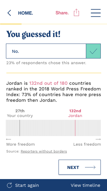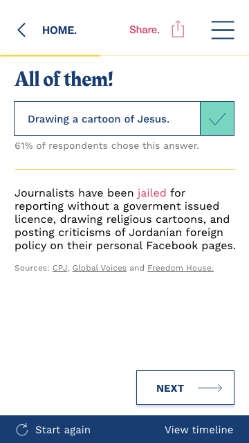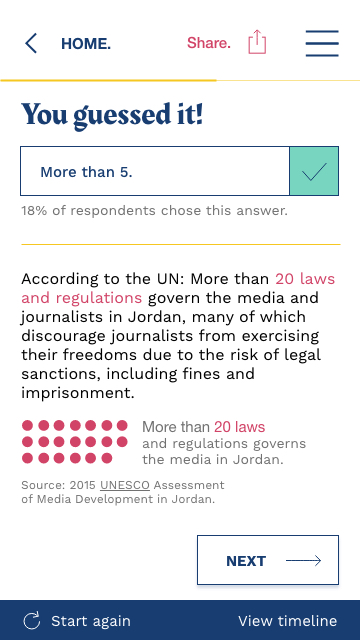Precisamente, el equipo del que formé parte se unió a Arij y se ocupó de scrapear información que, sistematizada en una base de datos, permitió analizar, y evidenciar, las formas en que las autoridades jordanas utilizan una serie de leyes para controlar la libertad de expresión y su efecto en los periodistas. Con ese insumo se diseñó un prototipo de sitio interactivo para denunciar estas restricciones y sus efectos en la sociedad.